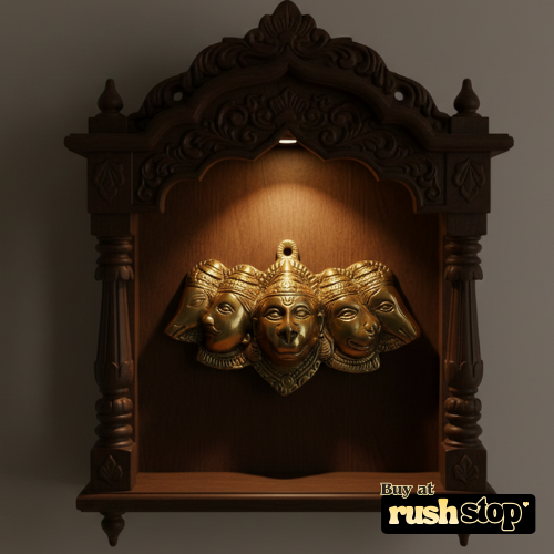 Each of the five faces—Hanuman, Narasimha, Garuda, Varaha, and Hayagriva—is expertly rendered with intricate engravings and a shimmering antique gold finish that catches the light beautifully. Ideal for placement above your main door or on a central living room wall, this Vastu-compliant idol serves as a divine shield against negative energy while enhancing your space with its royal, ethnic aesthetic. Whether you are performing a housewarming ceremony or simply wish to deepen the spiritual aura of your sanctuary, this Panchmukhi Hanuman hanging is a timeless piece of devotional art.