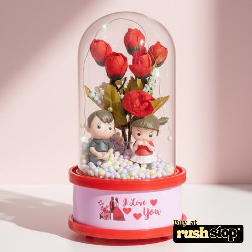 Romantic Red Rose Glass Dome with Cute Couple Figurine & LED Lights – "I Love You" Musical Style Showpiece for Valentine’s Day Gift, Anniversary, and Birthday Present